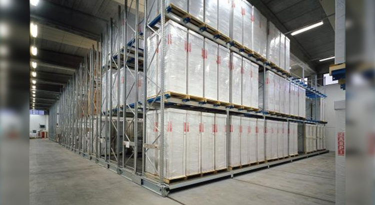 The racks are electronically powered and moved to enable a FLT to access every aisle when needed. Remote control panels can assist by linking FLT movements to throughputs. Specially constructed floors with running and guide rails are needed. Powered mobile is usually conceived at the planning stage and is used extensively in cold storage applications. High capacity and high usage close to 100% is common.